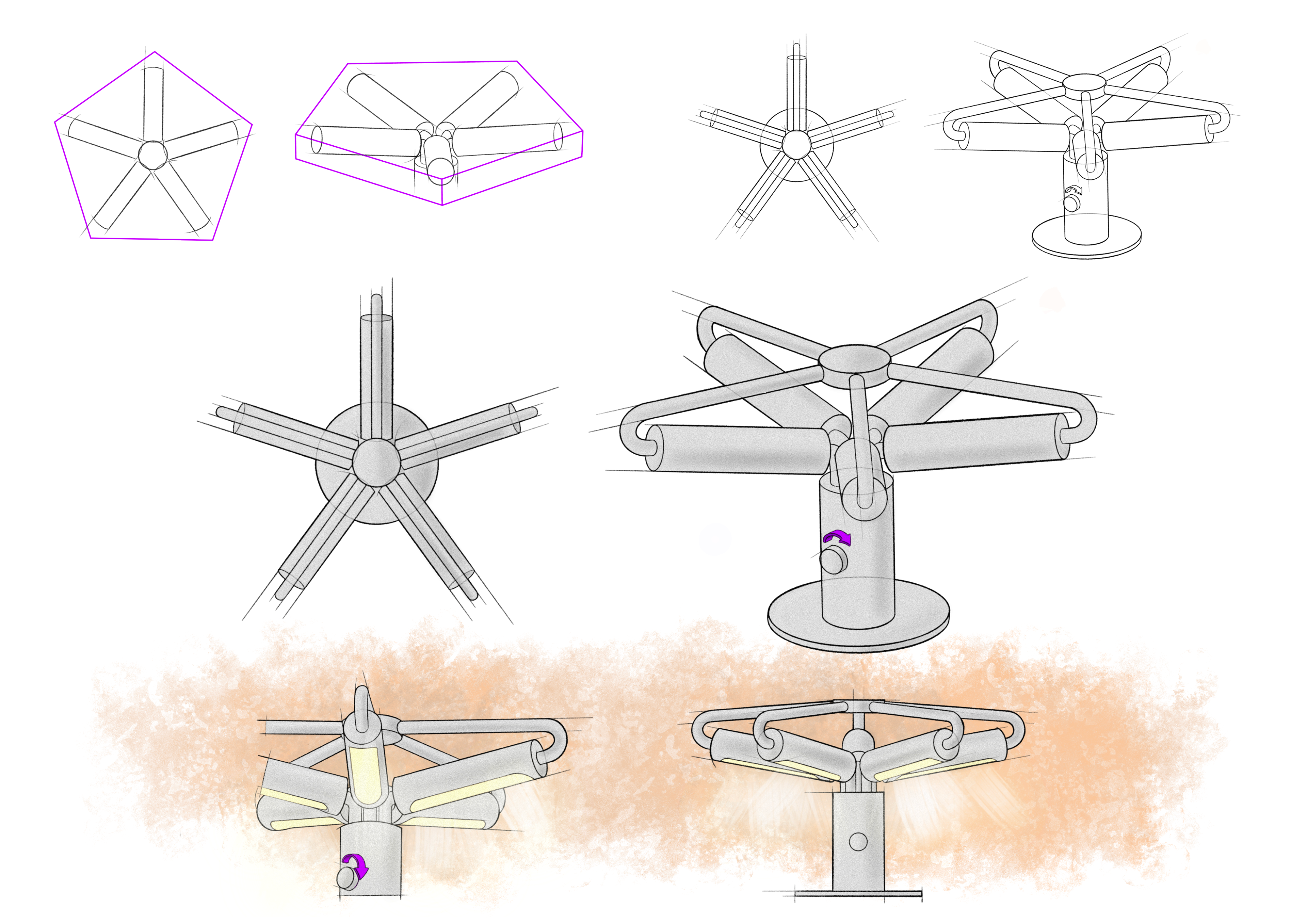 A modern decorative lighting concept initially inspired by the geometric shape pentagon. Modern lighting concept render in spaciousness with human interaction to show the concepts true size